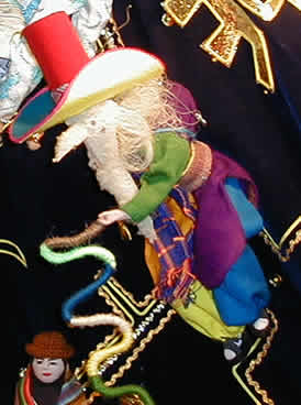 Traje en miniatura de Auqui auqui, note el bastón, el sombrero y el detalle en el traje.